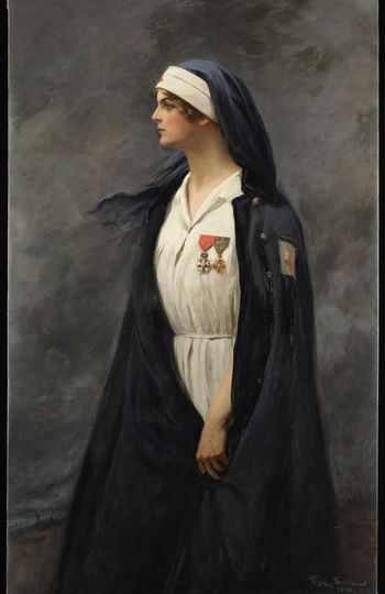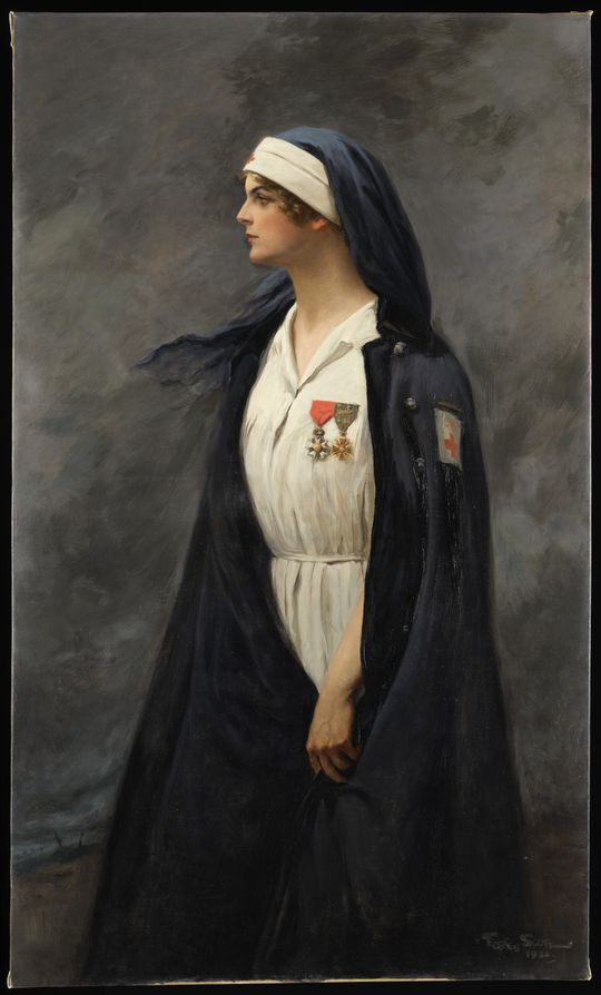 Son mari, Georges Scott, la peint ici en tenue d’infirmière et lui confère un statut de figure historique. La Croix de guerre et la Légion d’honneur sur sa blouse blanche, reçus dans la cour d’honneur des Invalides, rappellent la bravoure de cette femme engagée et plusieurs fois blessée.