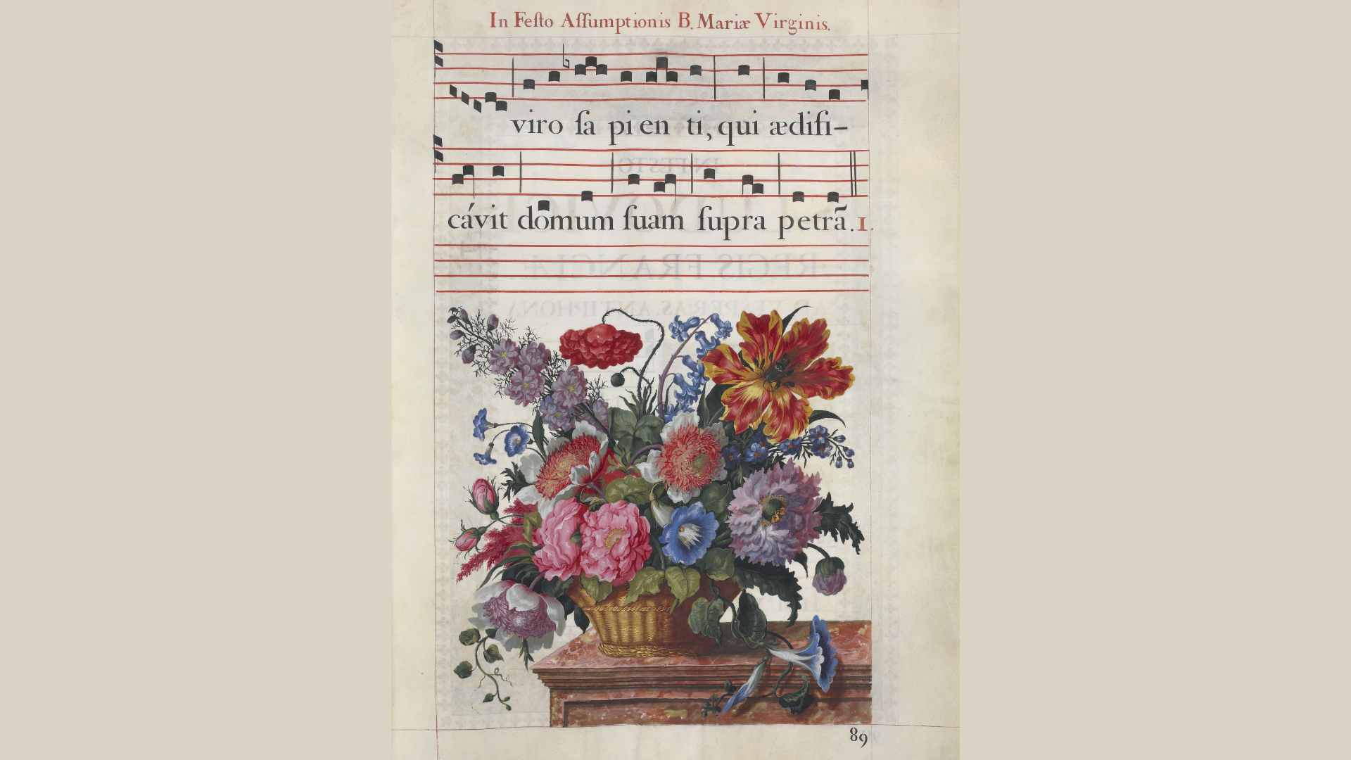 Le Graduale et Antiphonale de la Chapelle Saint-Louis des Invalides est digne de l’édifice qui l’abrita dès 1682. Il s’agit d’un livre de lutrin volumineux exécuté sur parchemin, noté au pochoir, et doté d’une luxueuse décoration peinte en couleurs, camaïeux et dorures de frontispices, bandeaux, encadrements, lettres ornées, paysages, bouquets, vases de fleur, vanités. Il fut le premier ou l’un des premiers parmi les « livres d’église travaillés par des invalides manchots » au sein de cette institution.