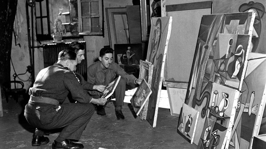 Robert Capa (1913-1954), Trois soldats devant des œuvres aux Grands-Augustins, 1er septembre 1944 © Robert Capa / International Center of Photography / Magnum Photos / Succession Picasso 2019