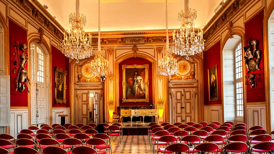 The Grand Drawing Room was the former council room and boasts a central location on the façade of the Invalides. Through the large bay windows, guests can enjoy a wonderful view, on one side over the main courtyard and the gilded dome of the Invalides, and the Esplanade des Invalides, the River Seine and the Alexandre III Bridge on the other. FIreplaces, monumental chandeliers, weaponry, portraits (Napoleon III, Louis XIV) and red velvet hangings all combine to provide dazzling elegance to this exceptional room, which was completely renovated in 2018.