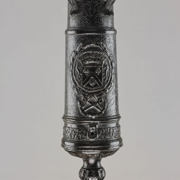 Au premier renfort se trouvent les armes de Galliffet – de gueules, au chevron d’argent, accompagné de trois trèfles d’or – surmontées d’une couronne marquisale, tandis que le chiffre du marquis – les lettres N et G en miroir en anglaises entrelacées, également surmontées de la couronne marquisale – se situe sur la volée, finement ciselée et parsemée de fleur de lys. Cependant, ce magnifique objet n’est ni daté, ni signé.